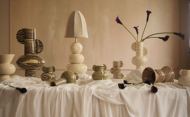 Henry says "These slender ceramic lamps are designed to cast light upwards on the wall and ceiling and to give a contrast to the wider shade designs in the collection which take up a bit more space. Made entirely from ceramic, I imagined these pieces to go at either side of a bed to create a relaxed lighting scheme when on but also act as interesting sculptures when not”