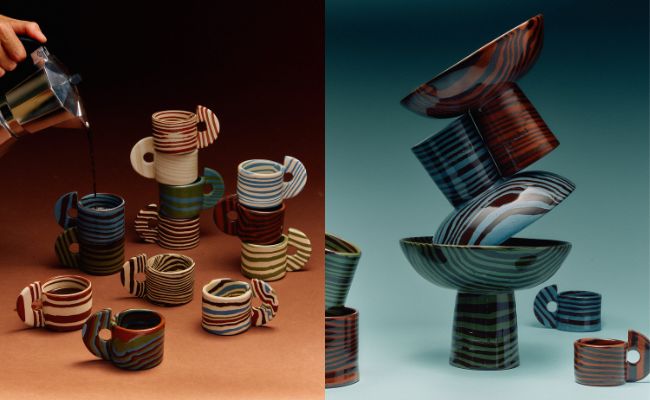 This piece is hand-built using a slab building technique in a mix of coloured clay and finished with a high gloss transparent glaze to show the unique and distinctive pattern beneath.