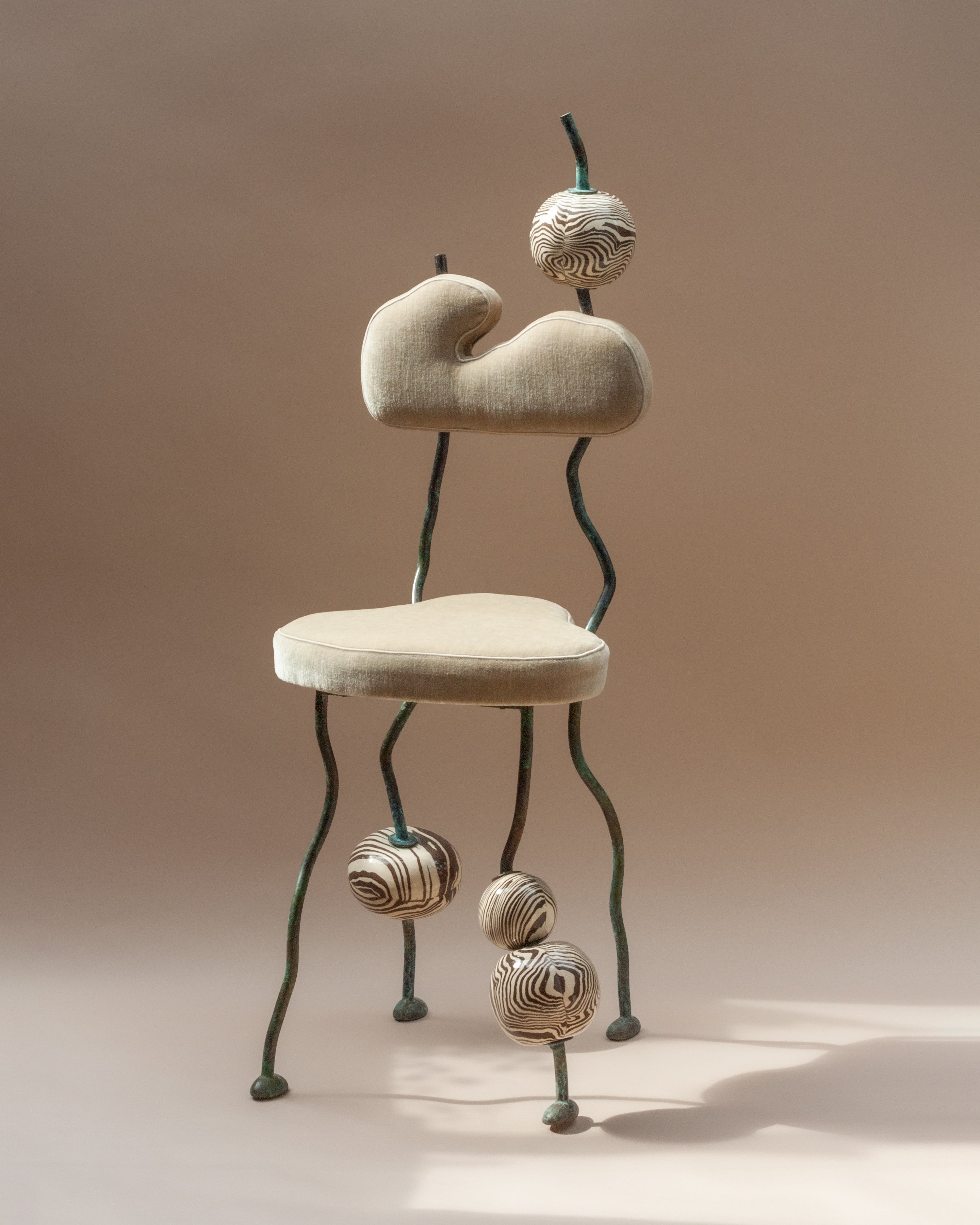 Materially, the collection brings together patinated bronze, plush mohair, and glazed earthenware, drawing inspiration from Brutalist and postmodern design while celebrating the poetic irregularities of handcraft.