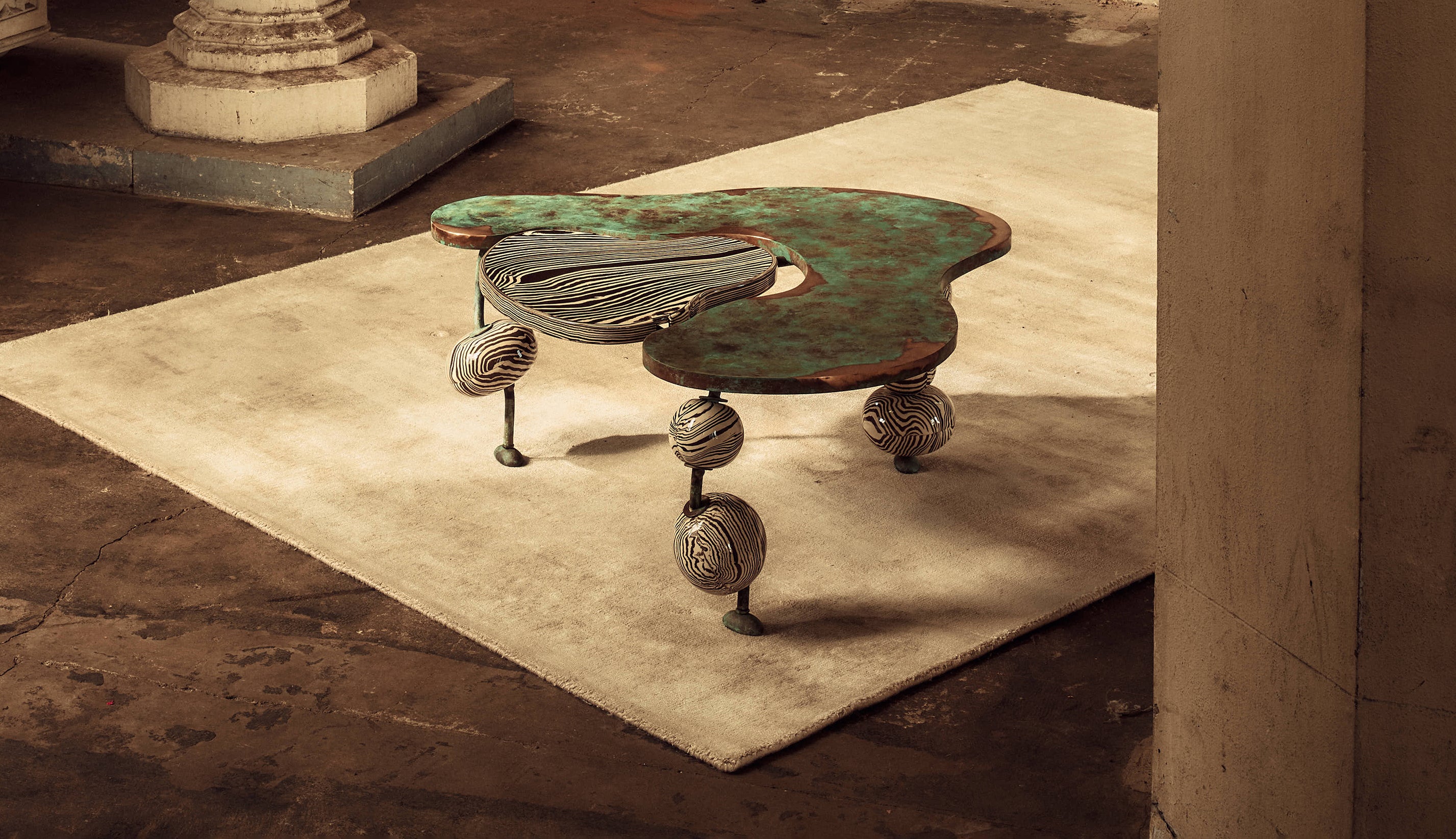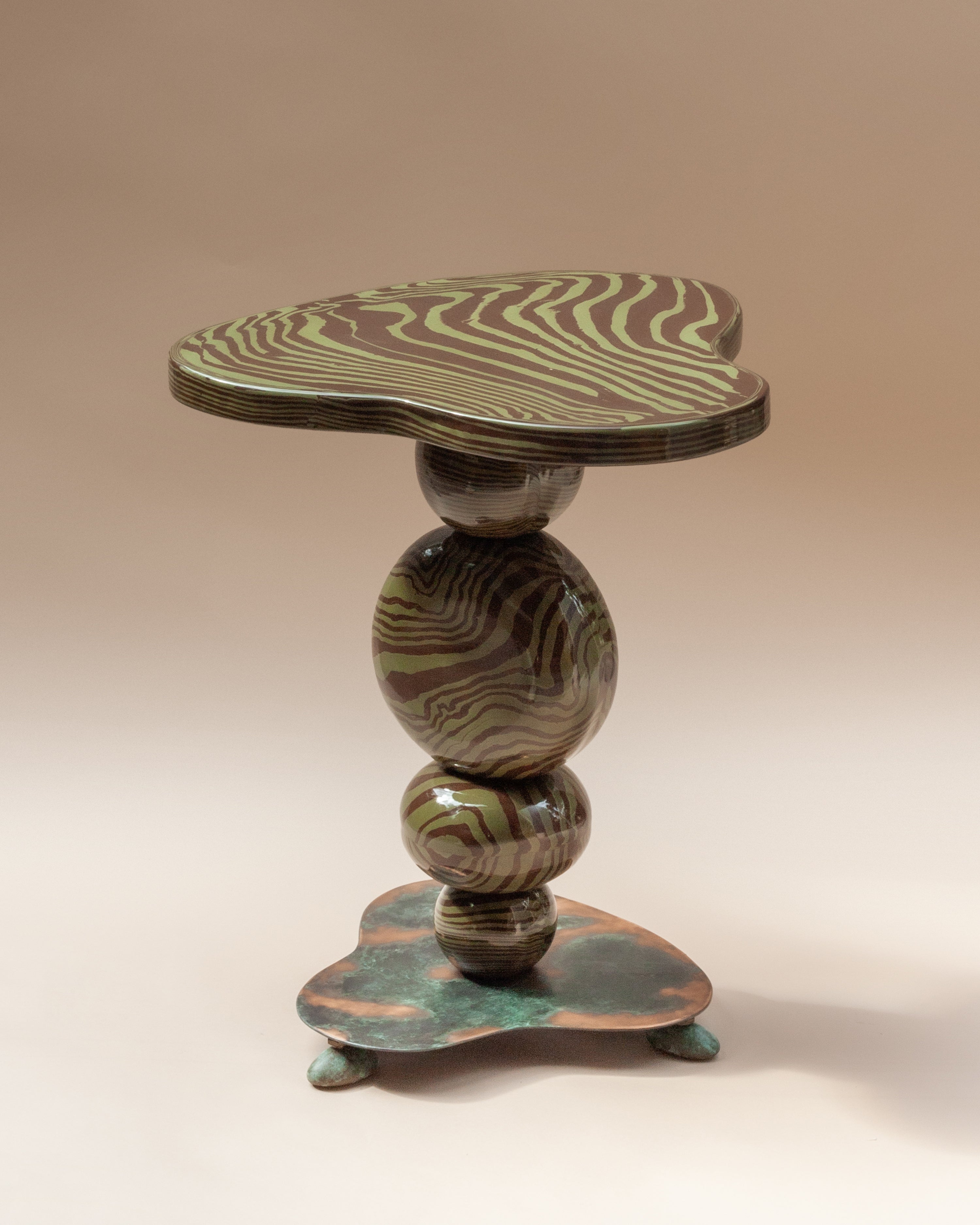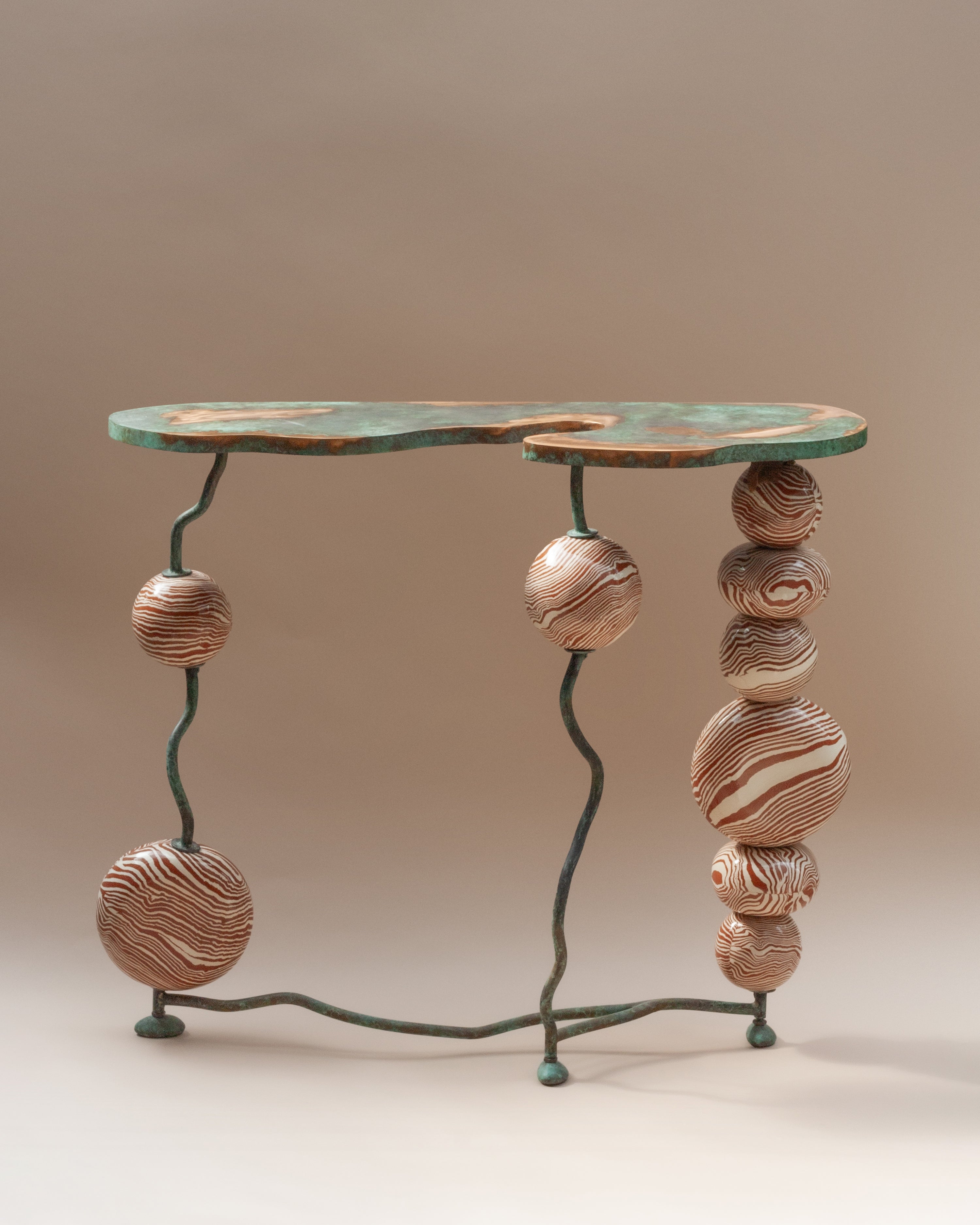 Nerikomi spheres – marbled ceramic orbs hand-built using the studio’s distinctive stacking, folding and rolling technique – appear throughout, threaded along the bronze legs of the tables and grounding the pouffe as sculptural feet.